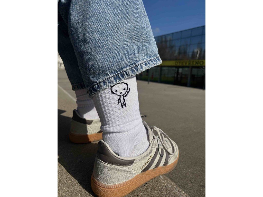 Bílé froté ponožky s motivem kuřáčků – malých postaviček, které dodávají každému kroku vlastní příběh.
