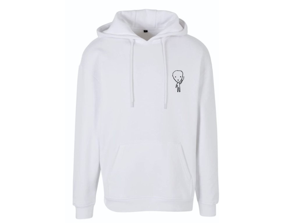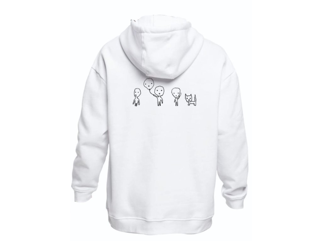 Bílá oversize mikina s kapucí zdobena motivem kuřáčků – drobné postavičky, které dodávají kousku osobitý příběh.