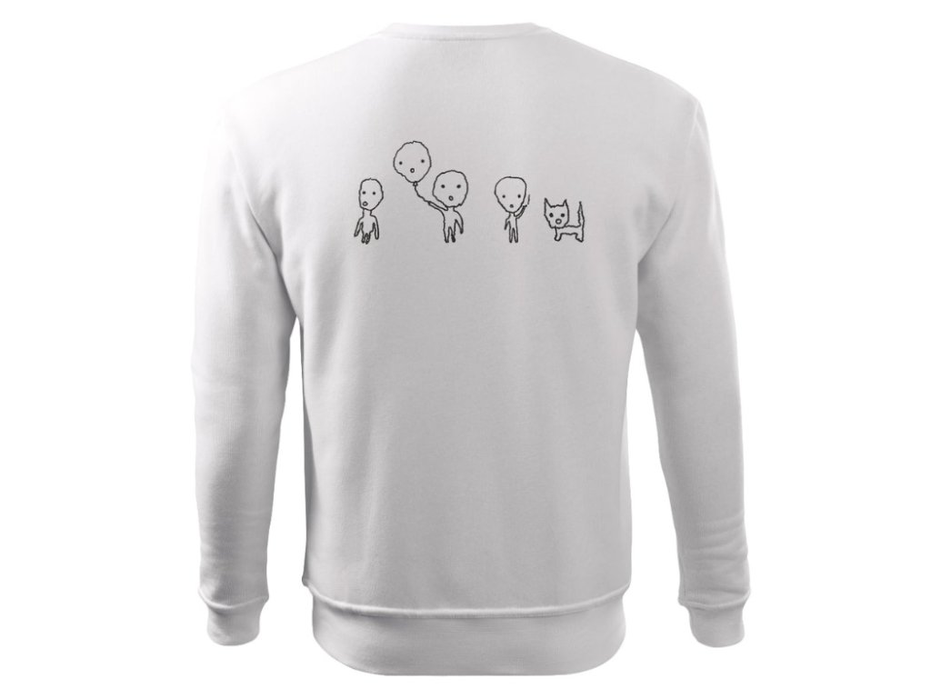 Bílá oversize mikina bez kapuce zdobena motivem kuřáčků – drobné postavičky, které dodávají kousku osobitý příběh.