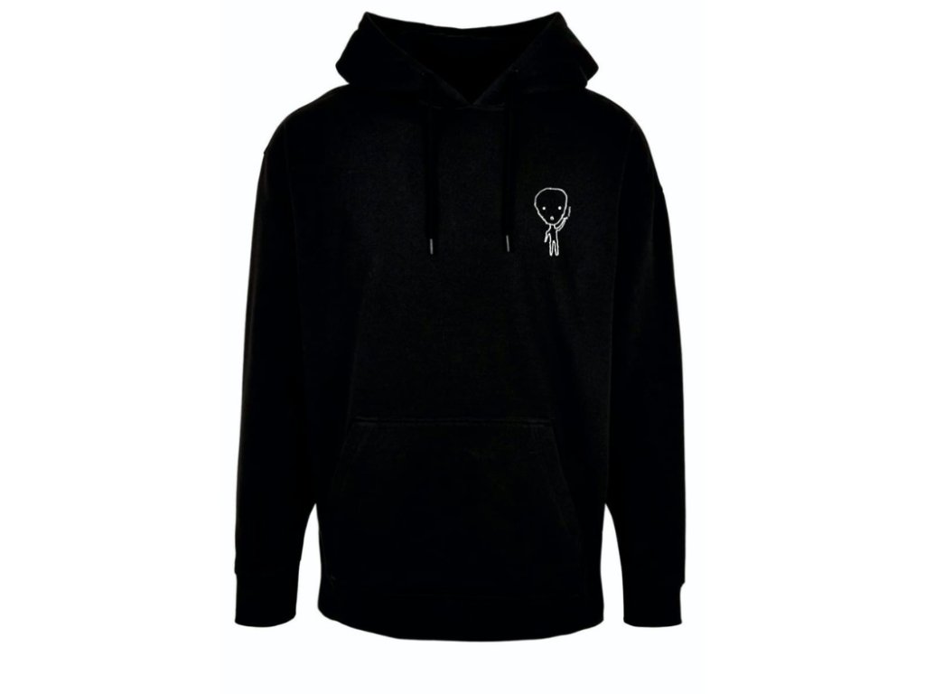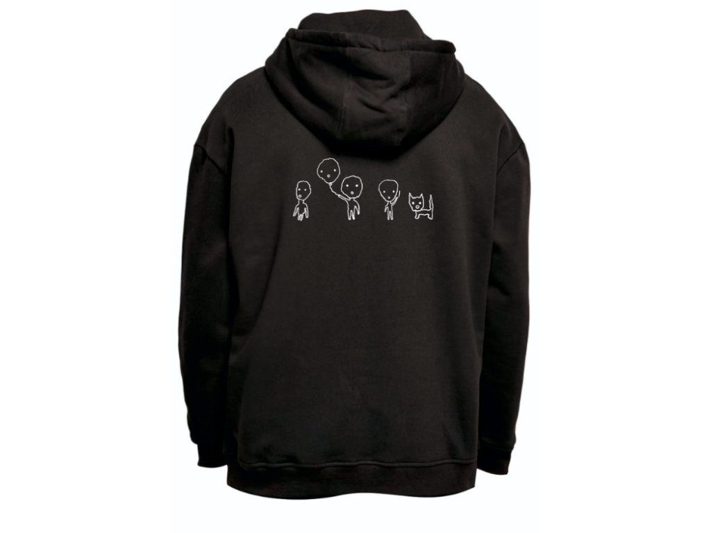 Černá oversize mikina s kapucí zdobena motivem kuřáčků – drobné postavičky, které dodávají kousku osobitý příběh.