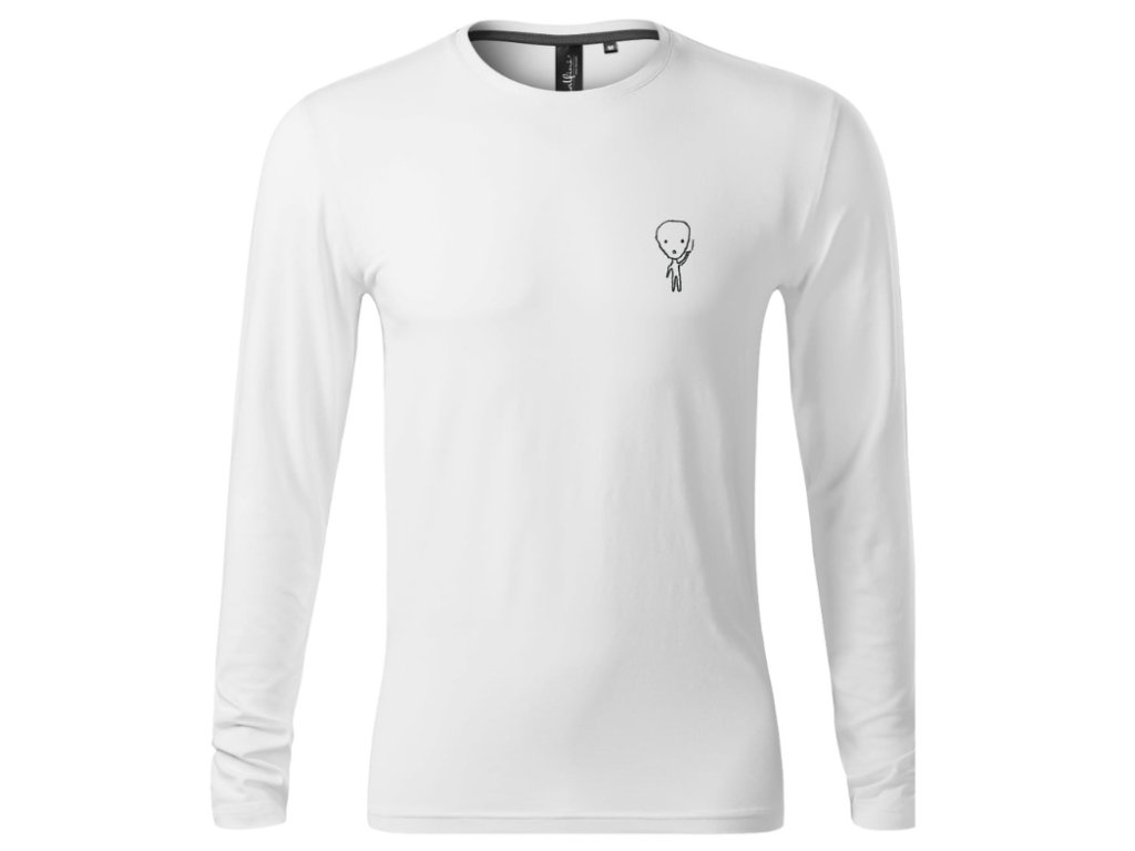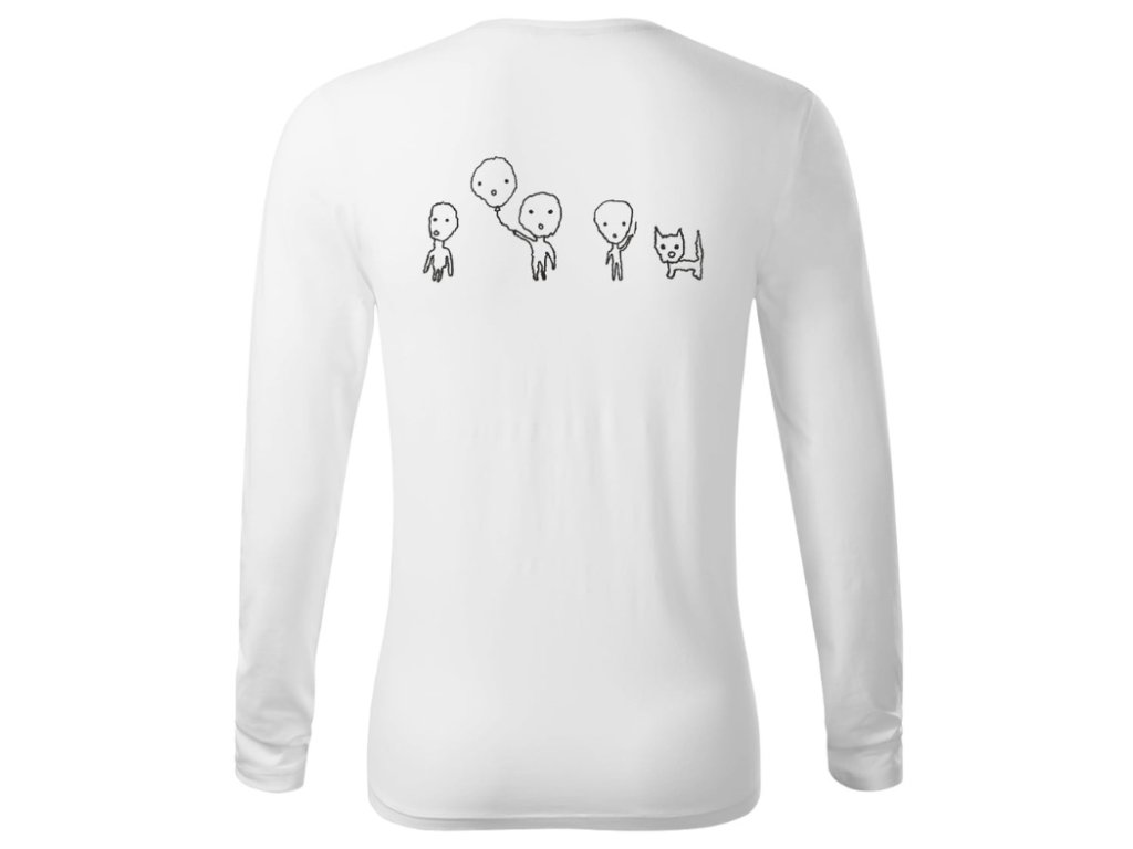 Bílé oversize triko s dlouhým rukávem s motivem kuřáčků – malých postaviček, které dávají kousku vlastní příběh.
